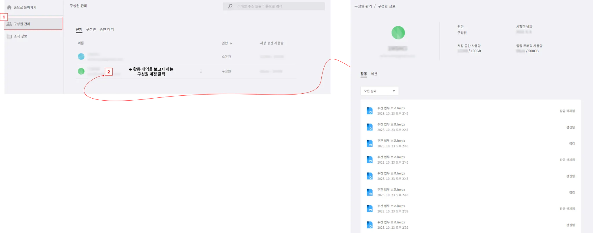 구성원이 문서를 편집한 활동 내역을 확인 할 수 있습니다.