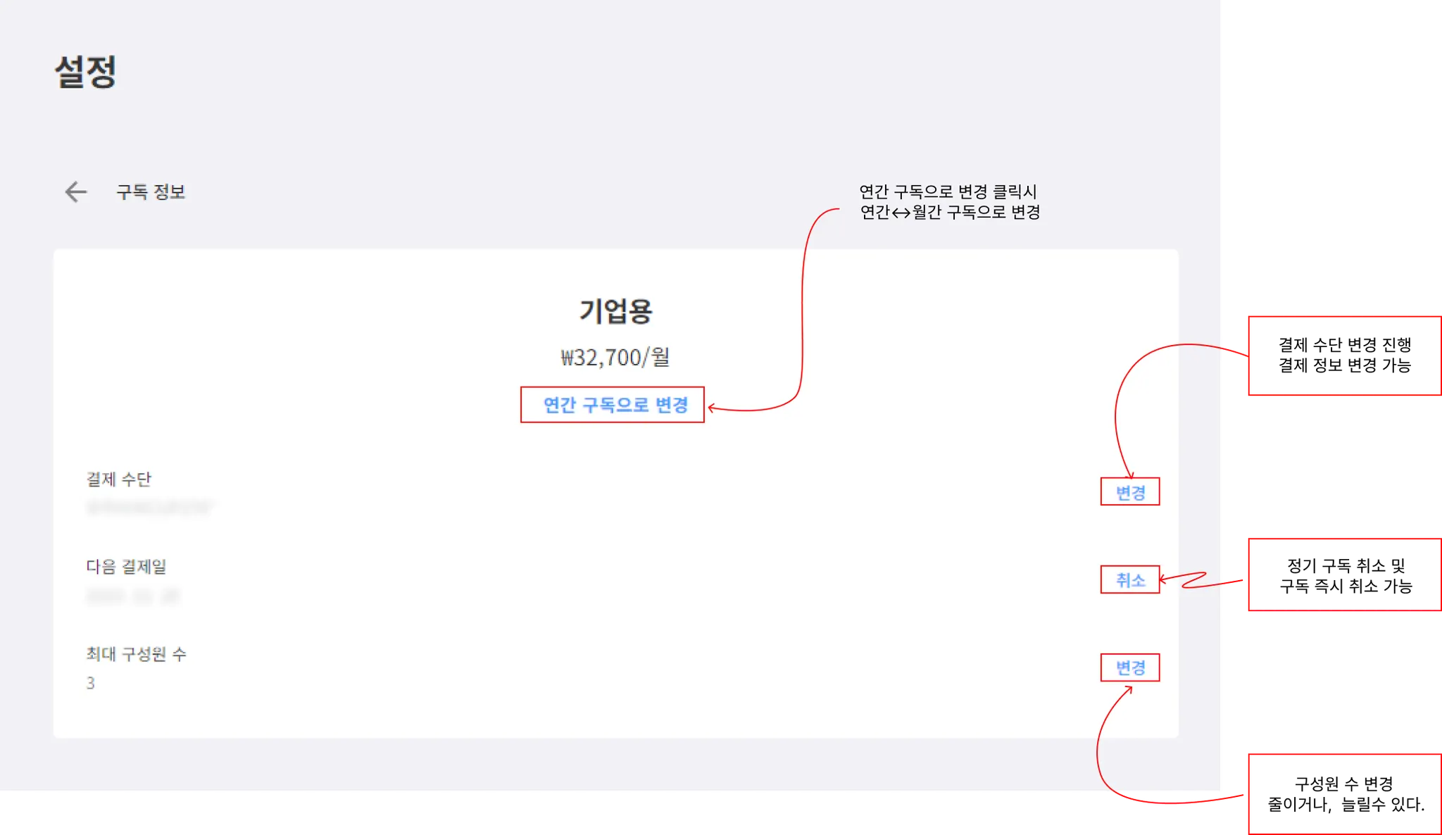 결제 수단 및, 구독 구성원 수, 연간/월간 요금제 변경 등 구독정보메뉴에서 결제 정보에 관련된 내용 변경 가능합니다.
