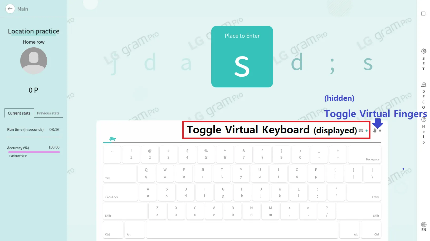 You can easily toggle the virtual keyboard and fingers on or off by clicking the keyboard and hand icons. For instance, you might choose to display the keyboard but hide the fingers.