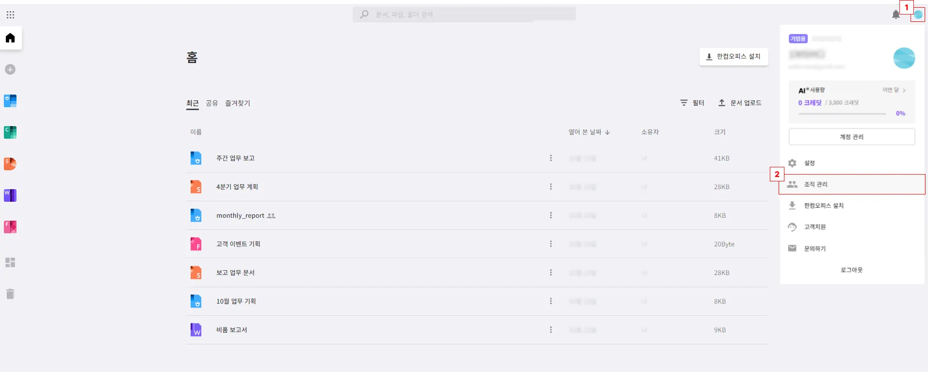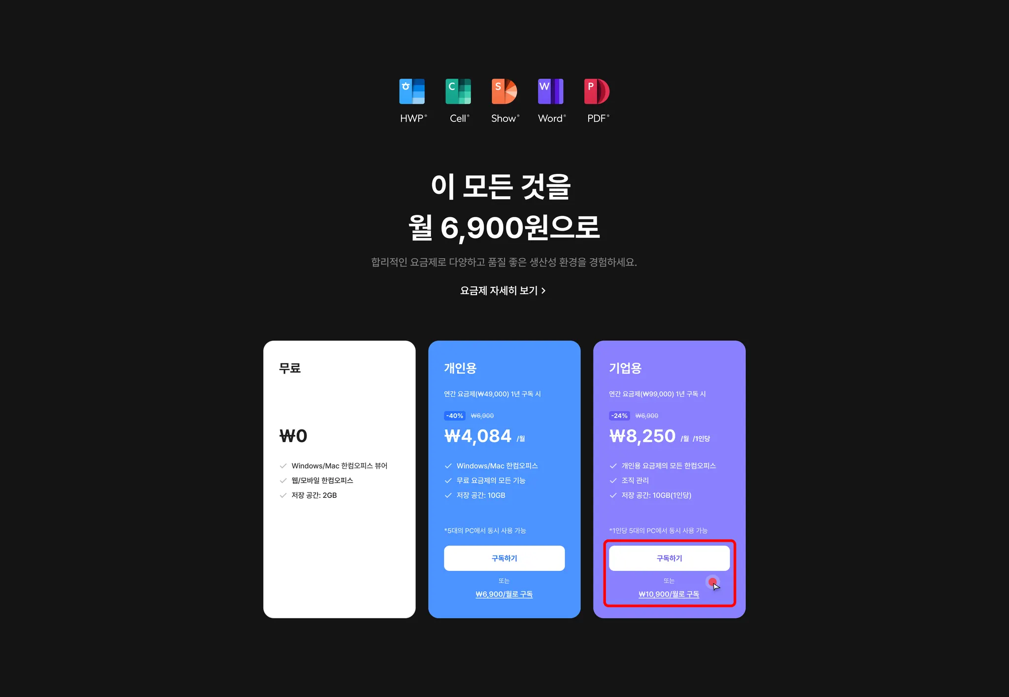 한컴독스 메인 화면 우측 상단 구독하기 버튼을 클릭 후, 기업용에서 원하는 요금제를 선택합니다.