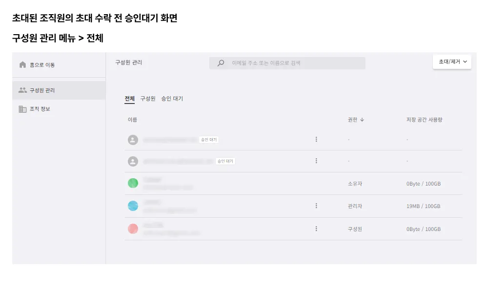 조직원 초대 시, 메일로 초대 안내 메일 발송되며, 조직원 초대 수락 여부 확인은 승인 대기에서 확인 가능합니다.