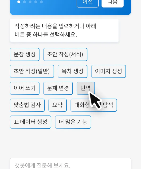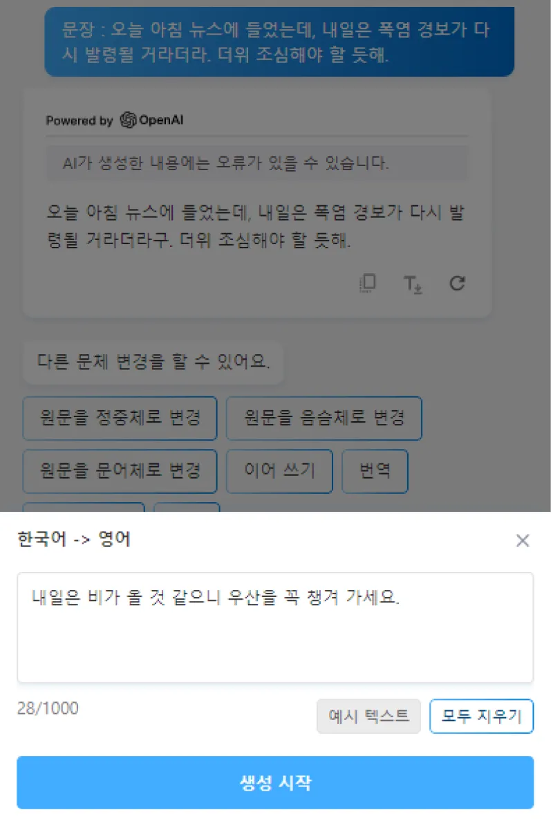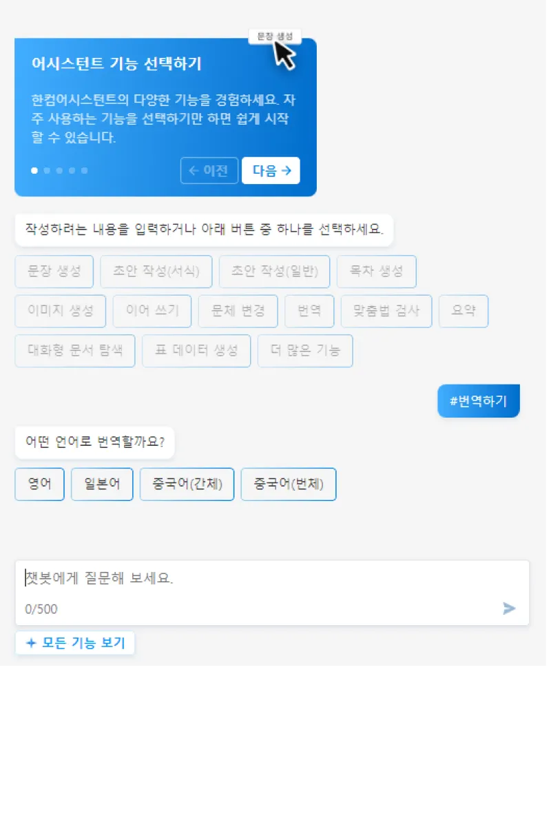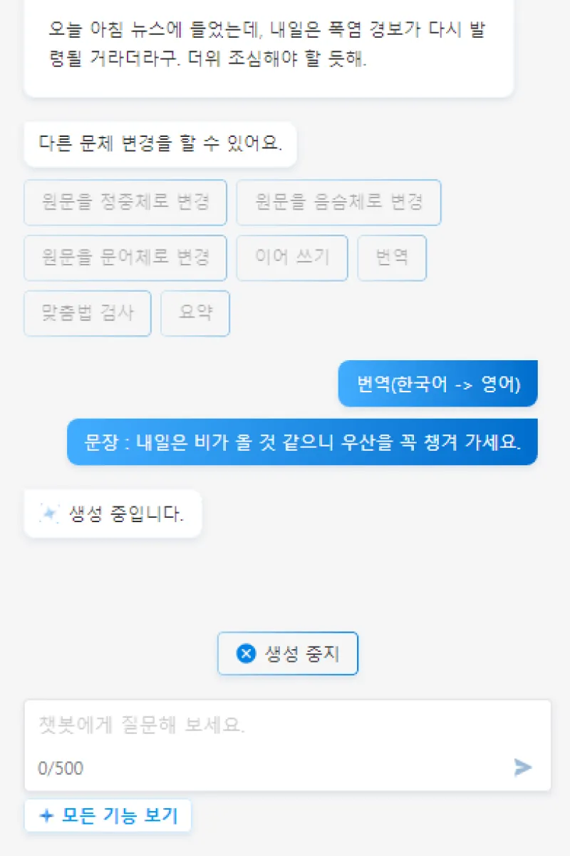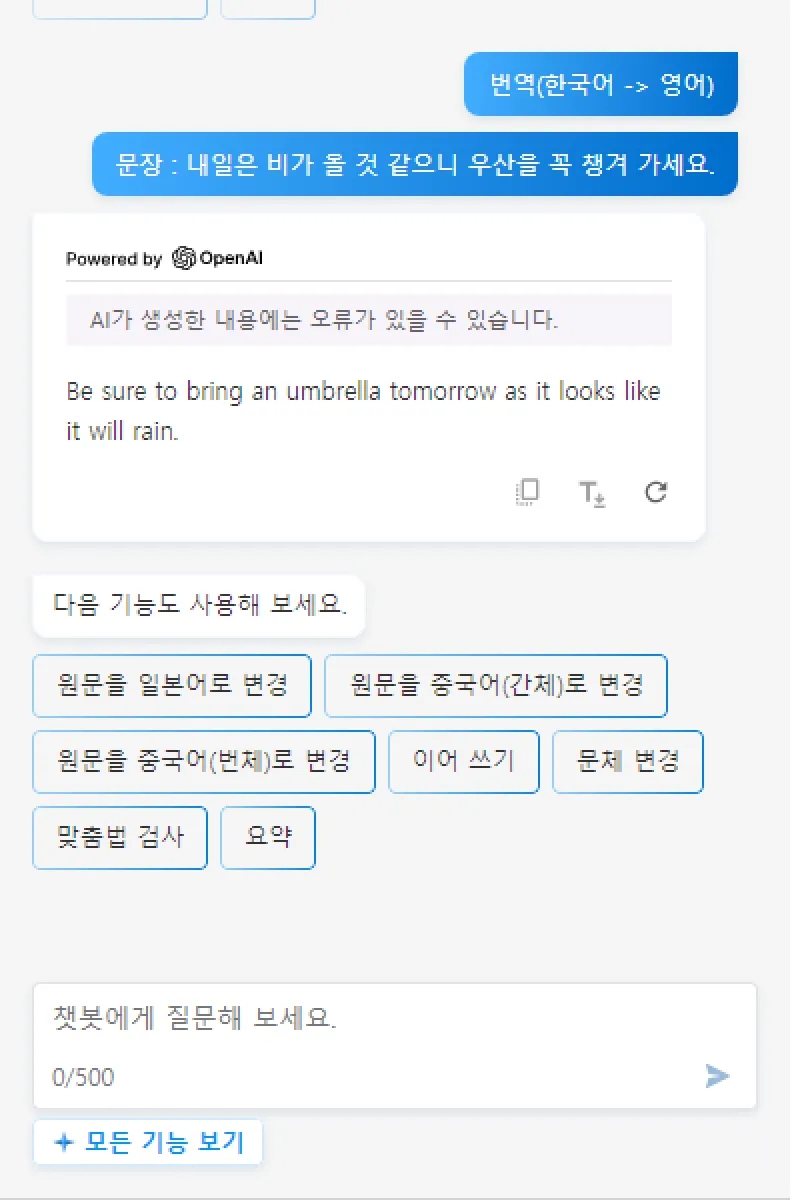 번역 시작 언어는 한국어로 실행되며, 챗봇 내 언어는 한국어만 지원합니다.