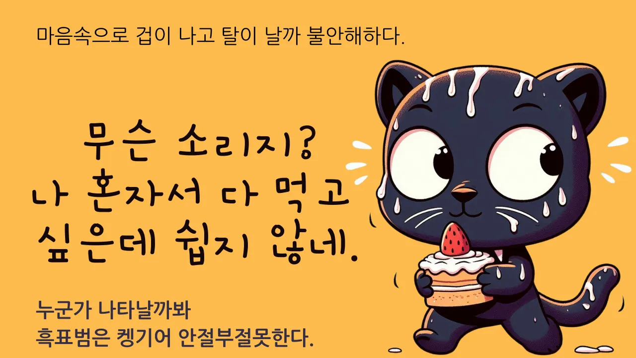 "무슨 소리지? 나 혼자서 다 먹고 싶은데 쉽지 않네." 누군가 나타날까봐 흑표범은 켕기어 안절부절못한다.