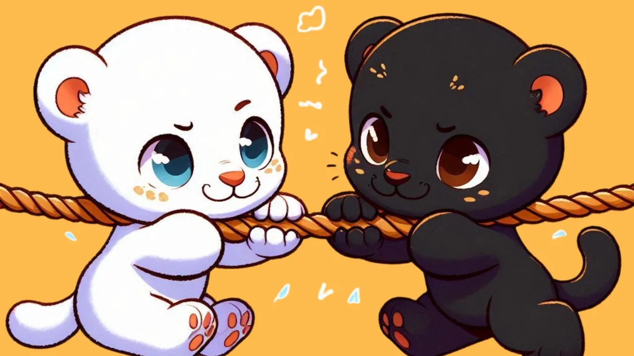 "이제 그만 줄을 놓게나." 백표범과 흑표범이 줄을 켕기고 있다.
