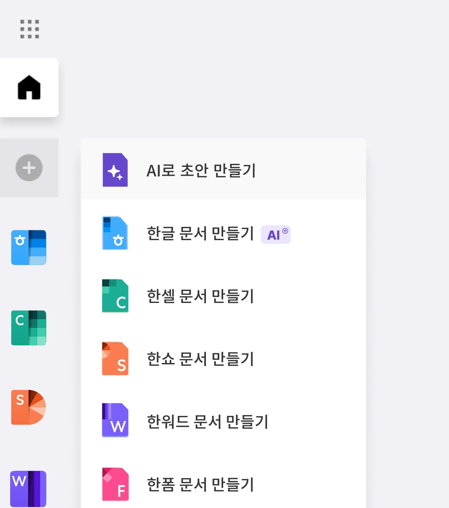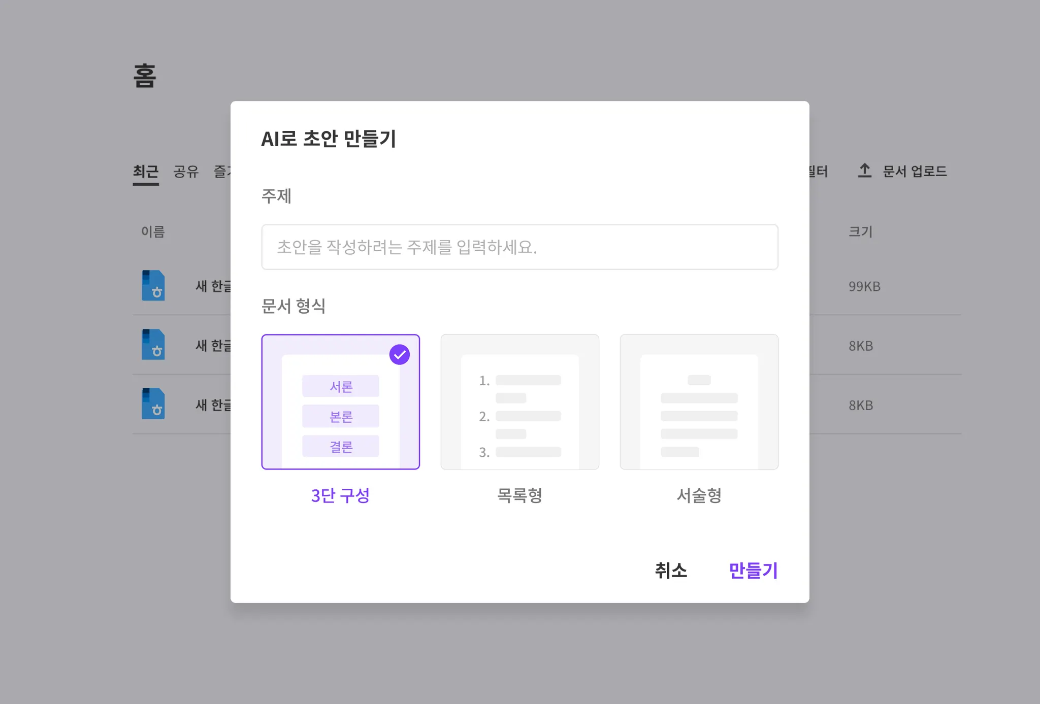 AI 초안 만들기는 3가지 유형의 서식으로 문서를 생성할 수 있습니다.