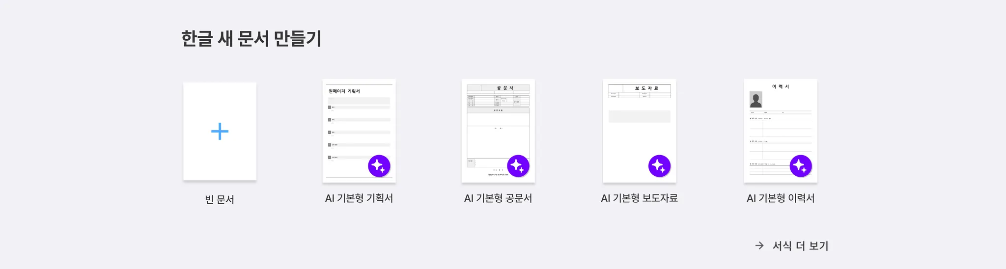 한글 홈 화면에서는 4종의 서식이 보입니다.