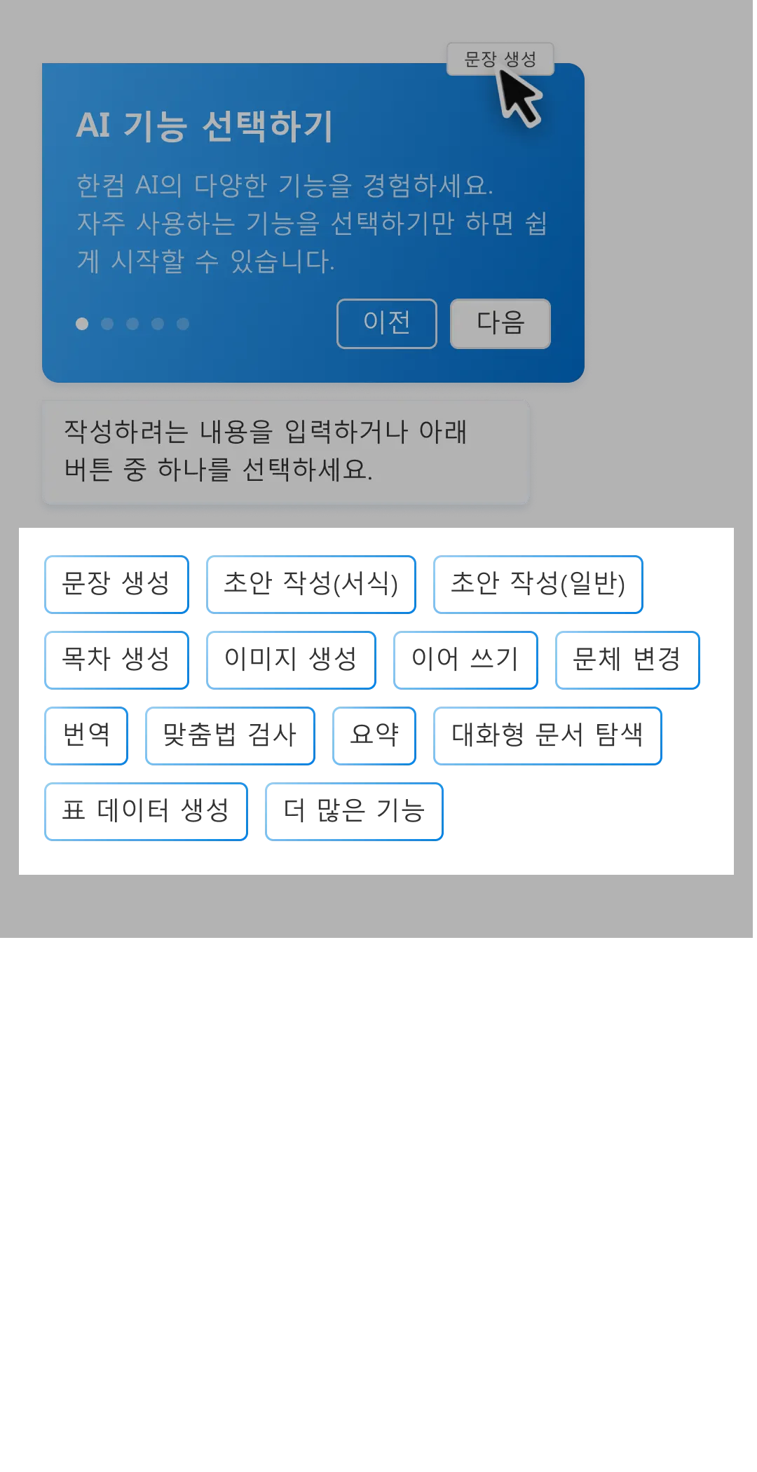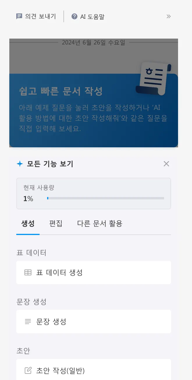 이어 쓰기 : 현재까지 작성된 문장을 분석하여 문맥에 맞는 이후 문장을 생성하는 기능