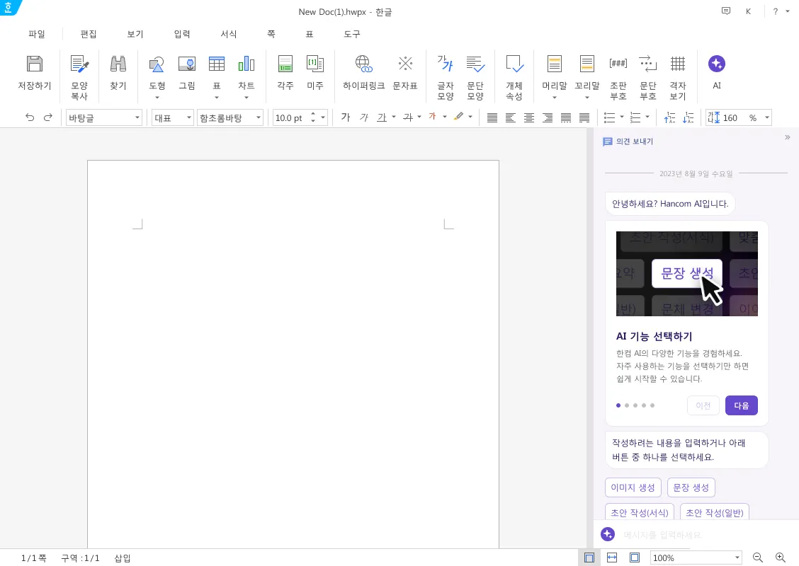 웹 한글에서 2가지 방법으로 AI 기능을 이용할 수 있습니다.