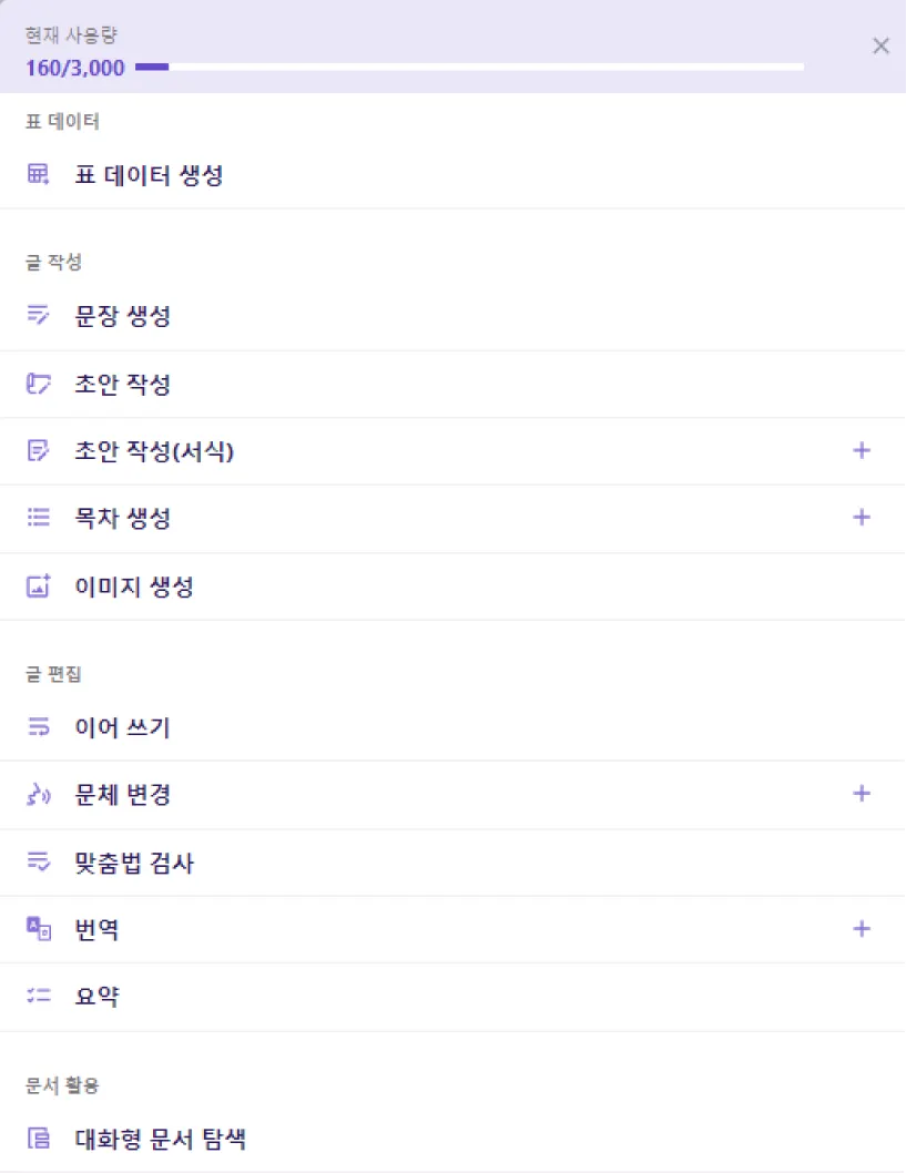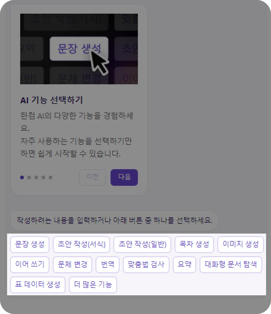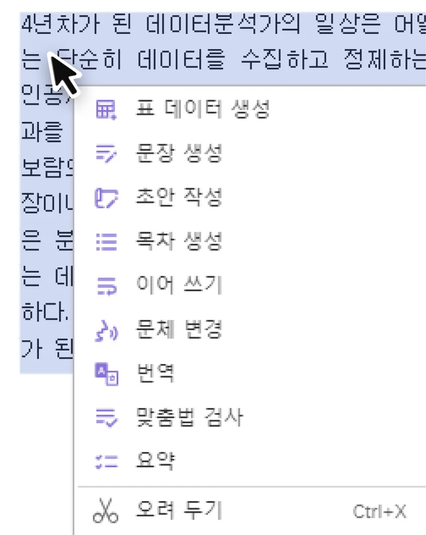 이어 쓰기 : 현재까지 작성된 문장을 분석하여 문맥에 맞는 이후 문장을 생성하는 기능