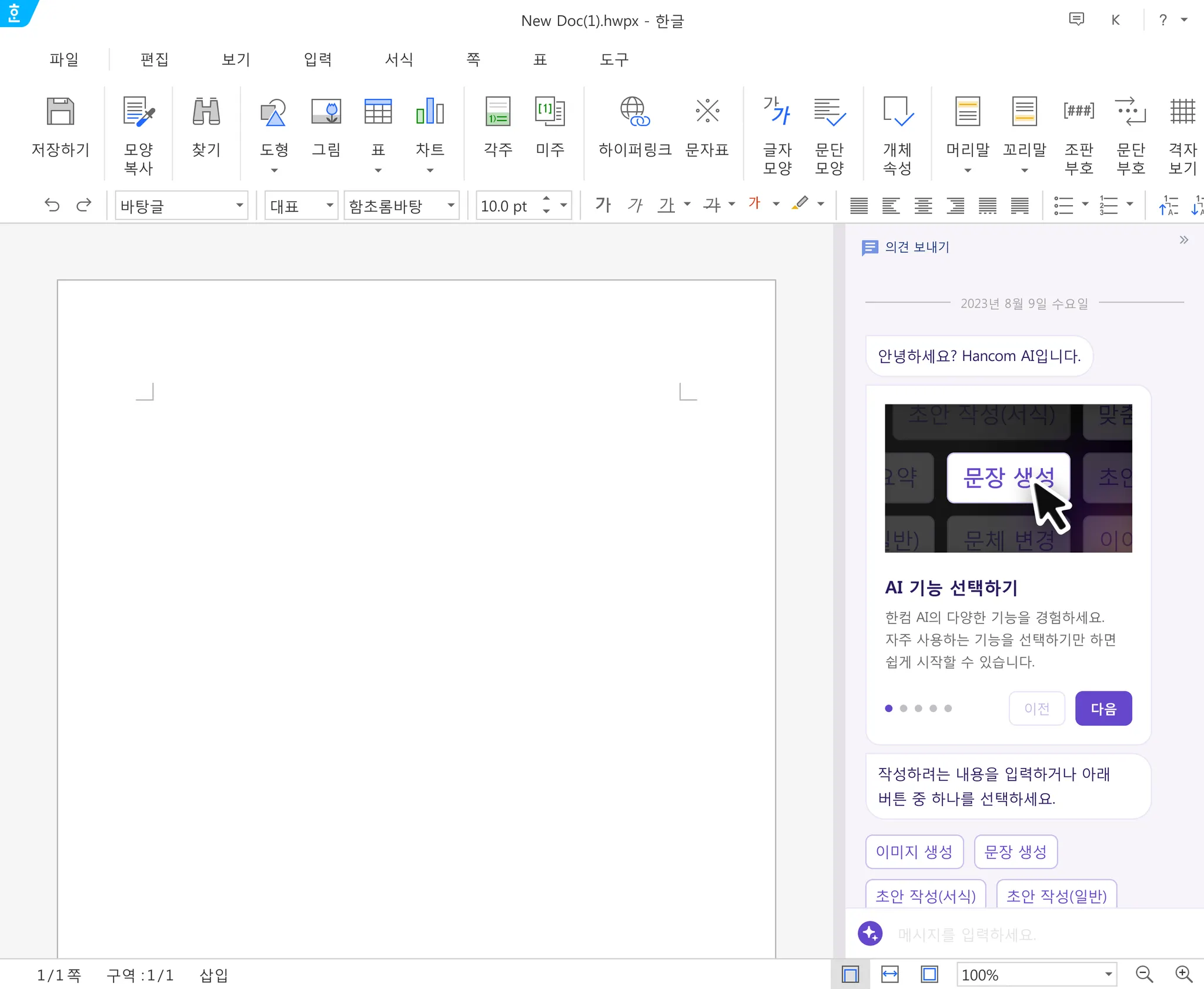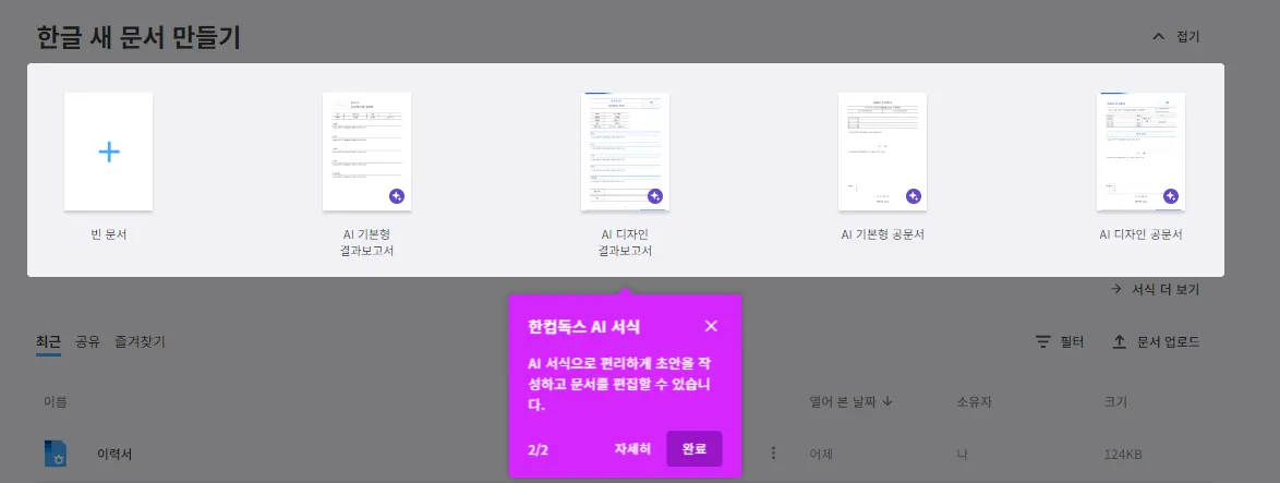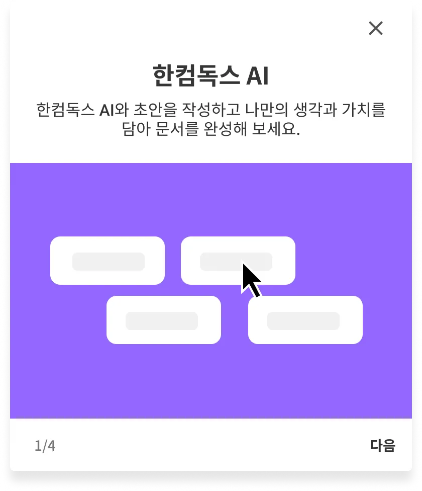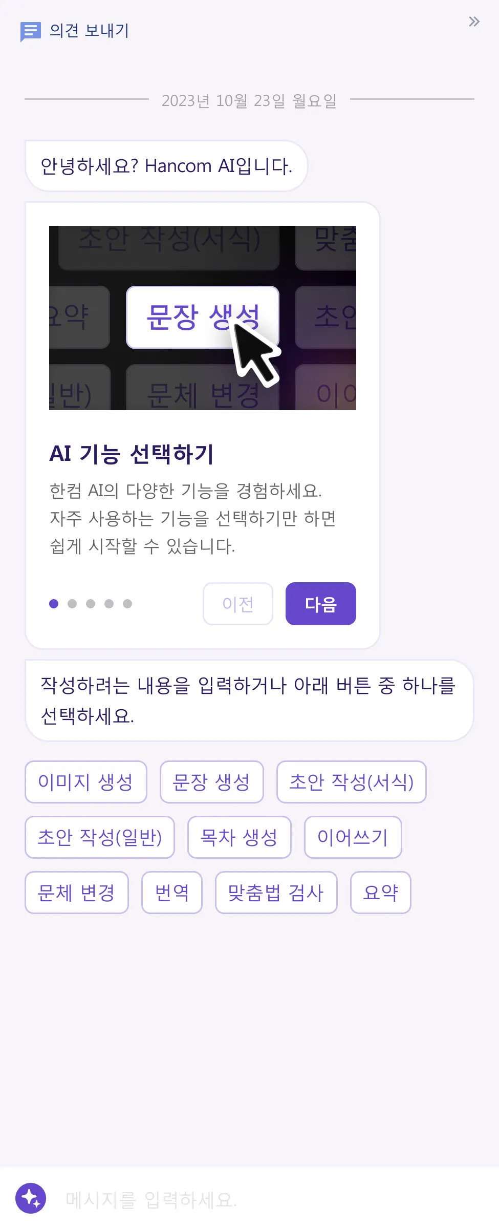 안내 팝업 및 안내 가이드(도움말)를 통해 한컴독스 AI를 확인해 보세요.