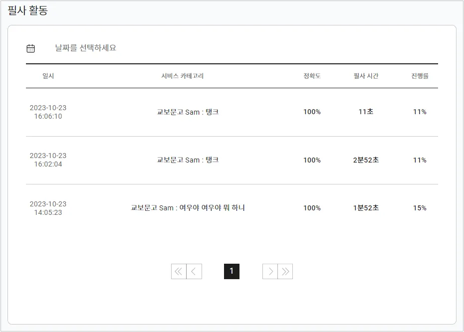 [필사 활동]에서는 정확도, 필사 시간 등을 알 수 있습니다.