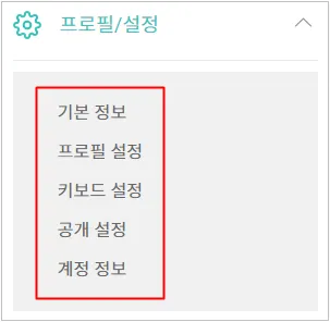 [마이페이지] 좌측 네비게이션 바에서 [프로필/설정]을 클릭하면 나의 기본 정보와 각종 설정 등을 확인할 수 있습니다.