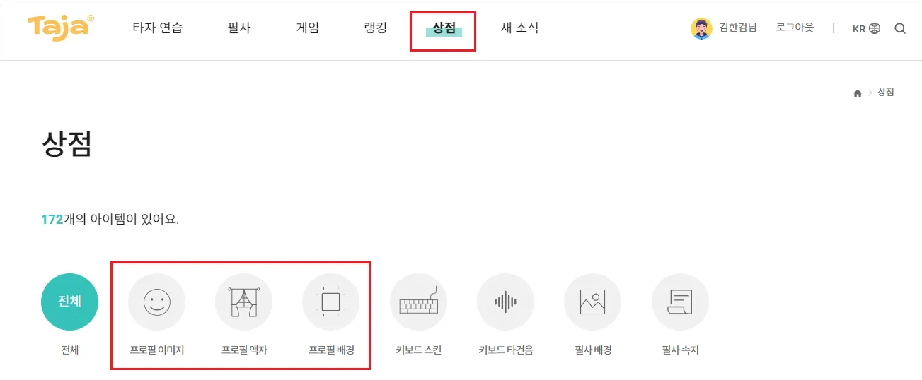 [프로필 이미지], [프로필 액자], [프로필 배경]을 선택할 수 있고 해당 아이템들은 아래 사진과 같이 모두 [상점]에서 ‘포인트’로 구입할 수 있습니다.