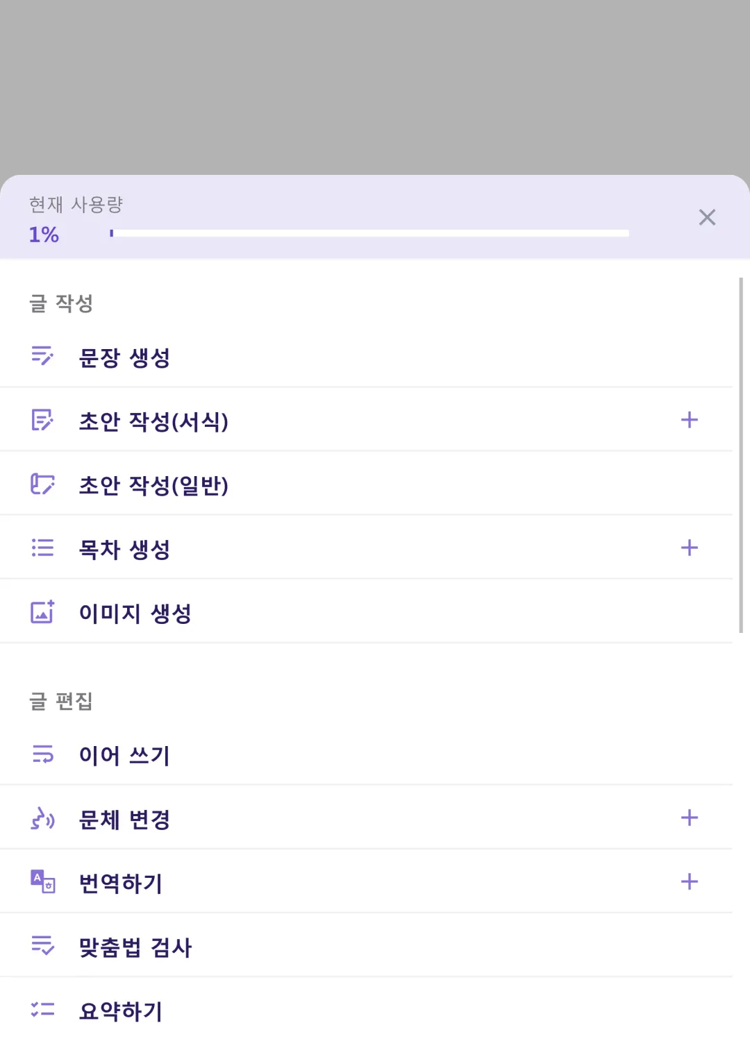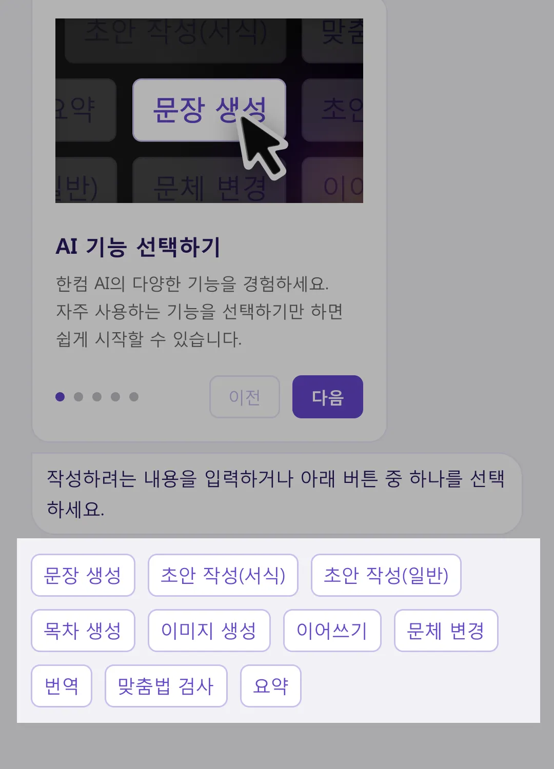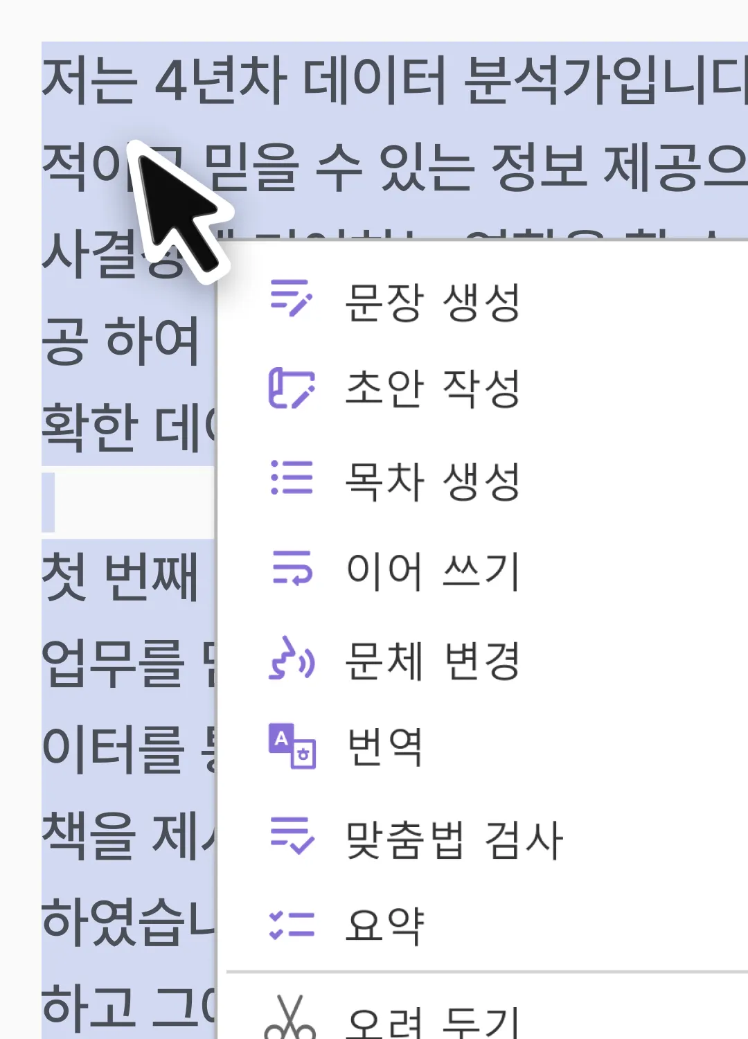 이어 쓰기 : 현재까지 작성된 문장을 분석하여 문맥에 맞는 이후 문장을 생성하는 기능