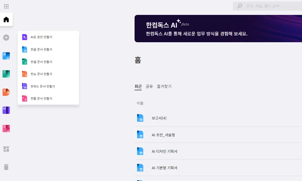 한컴독스 접속 이후 2가지 경로를 통해 한컴독스 AI를 사용할 수 있습니다.