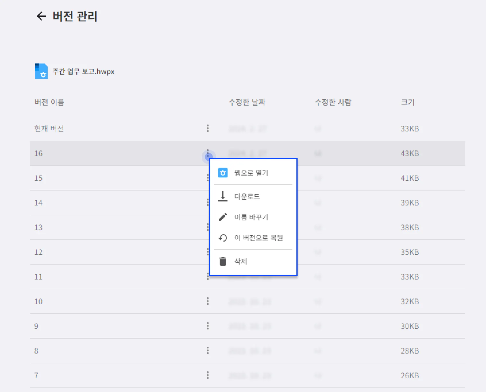 또한, ‘버전 관리’에서 우측의 더보기(…)를 클릭하시면 해당 버전으로 문서를 복원하거나 다운로드, 삭제를 할 수 있습니다. 문서 버전은 최대 20개까지 지원됩니다.