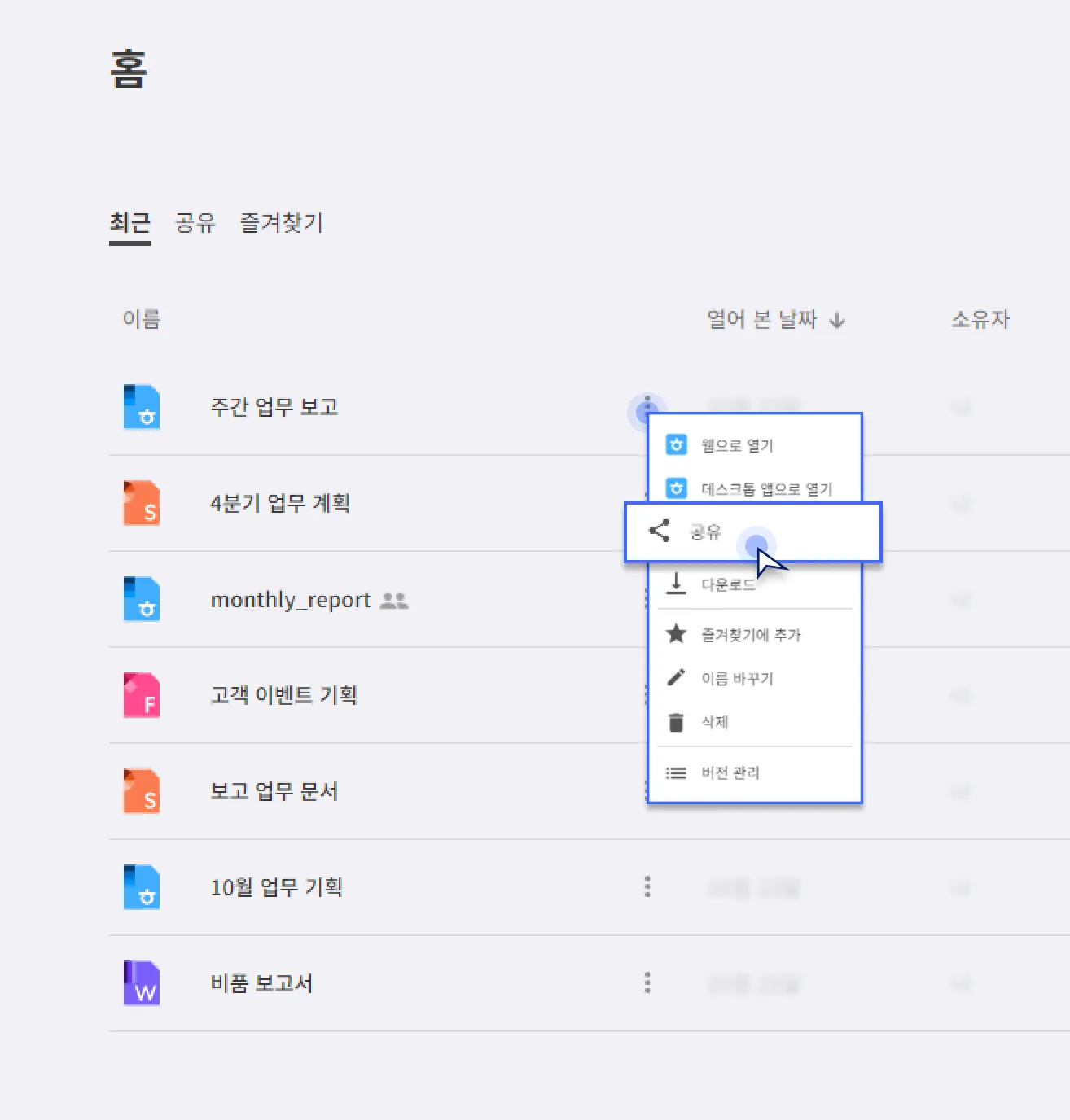 공유하려는 파일의 더보기(...) 메뉴에서 '공유'를 선택합니다.