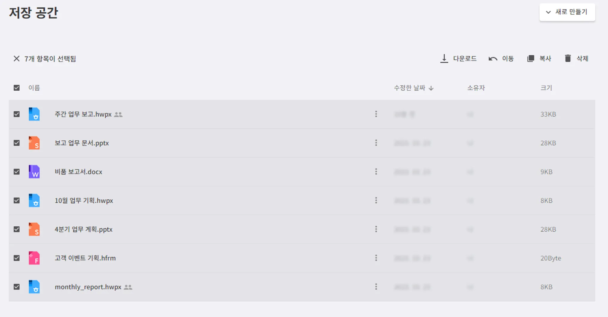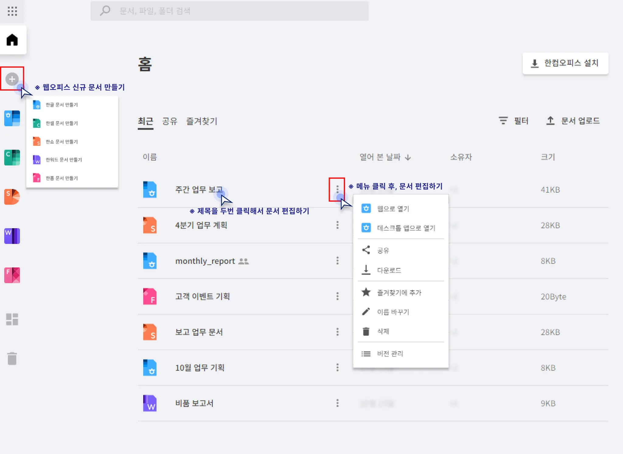 한컴독스에서는 새 문서 만들기, 파일 복사, 이동, 이름 바꾸기, 삭제와 같은 파일 관리를 제공합니다.