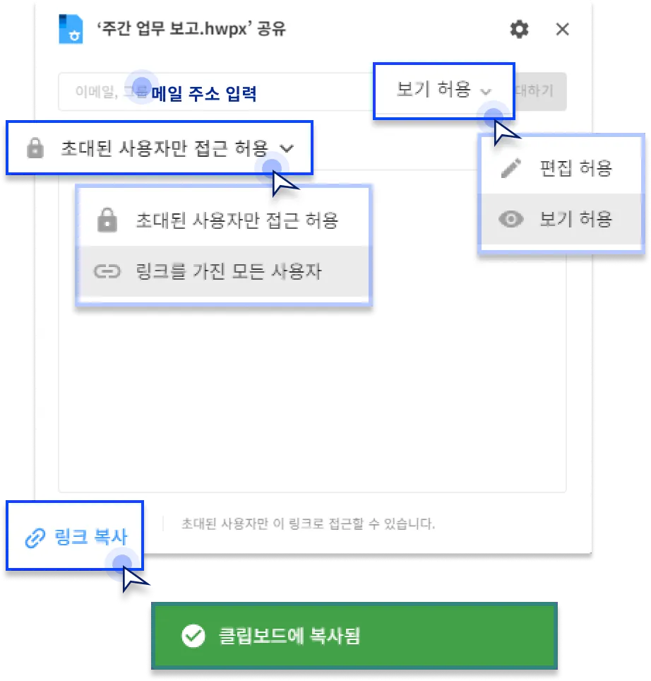 메일 주소를 입력해서 문서를 공유합니다. 보기 및 편집 권한을 설정할 수 있습니다.