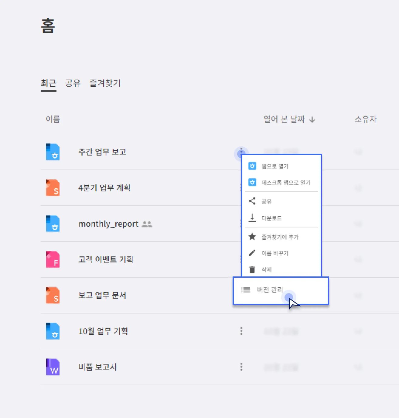파일 선택 후 더보기(…)를 클릭하시고 ‘버전 관리’ 메뉴를 선택하시면 해당 파일의 버전 기록이 나옵니다. 원하시는 문서 버전을 클릭하시면, 해당 문서를 확인하실 수 있습니다.
