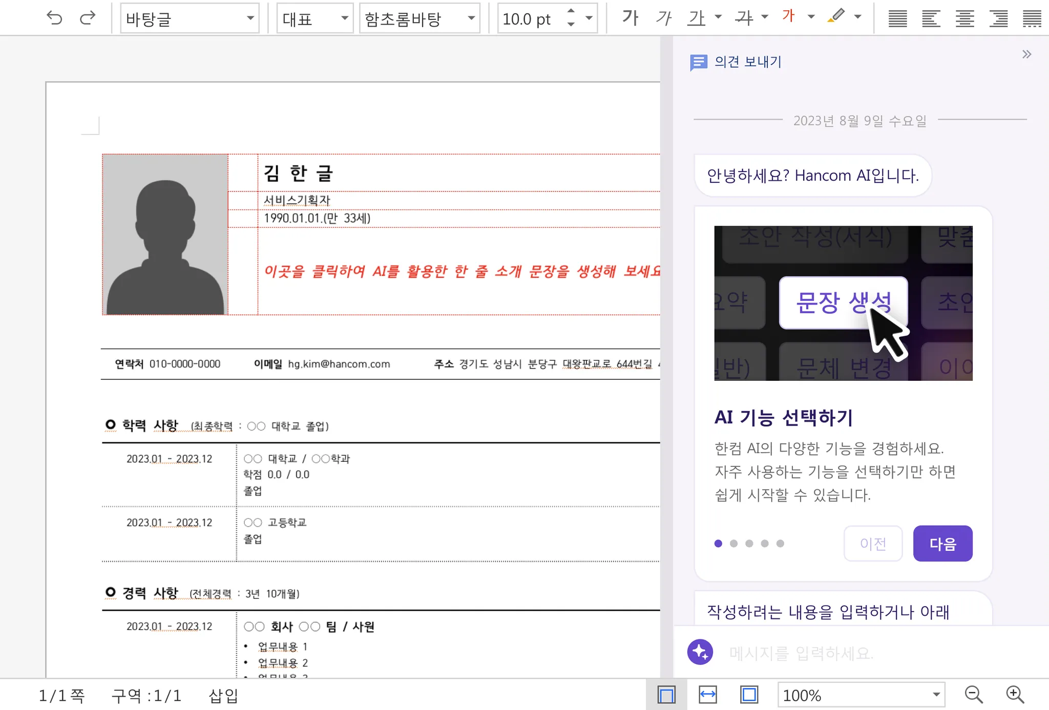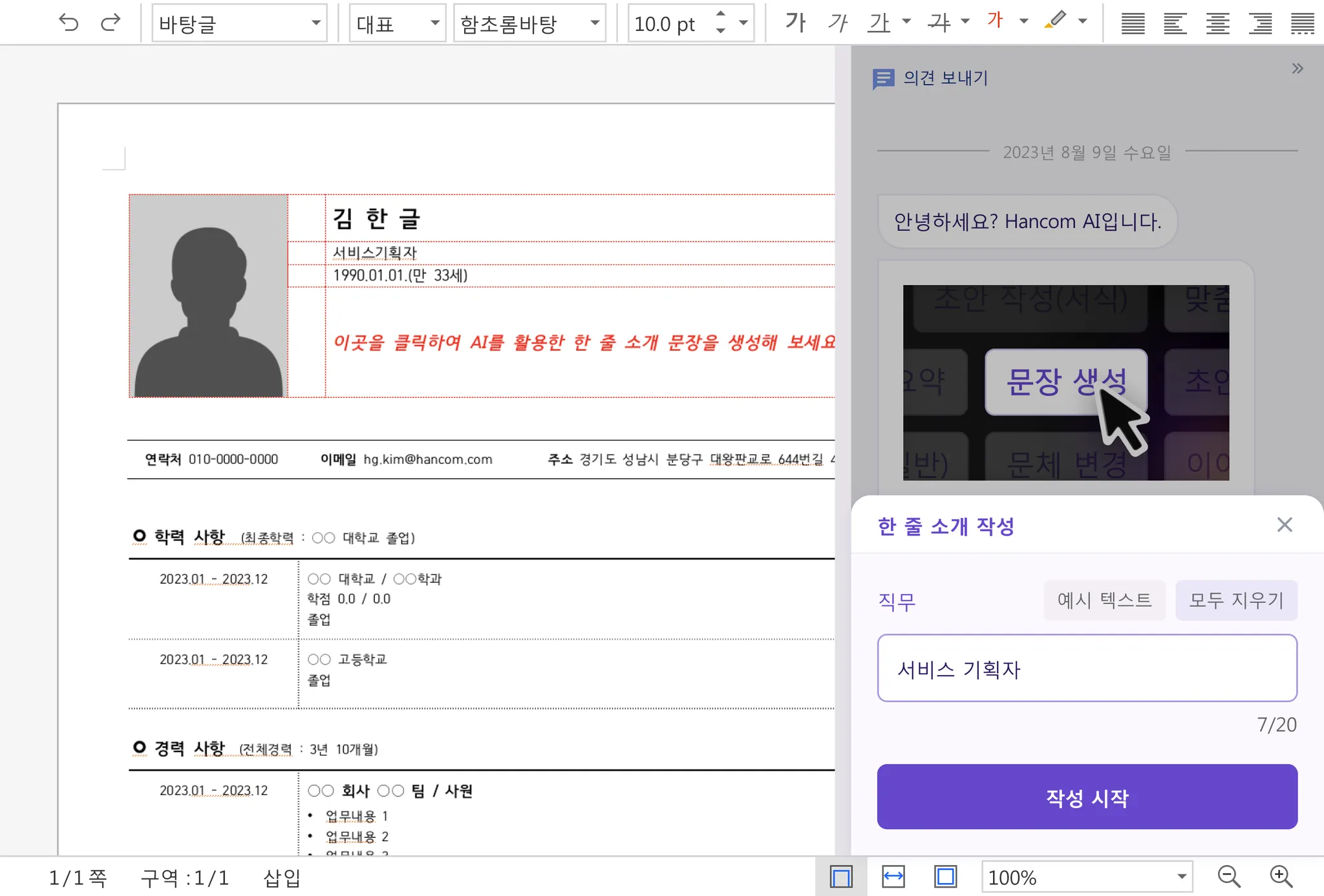 이력서 서식은 직무를 입력하면 AI를 통해 한 줄 소개 문장을 생성할 수 있습니다.