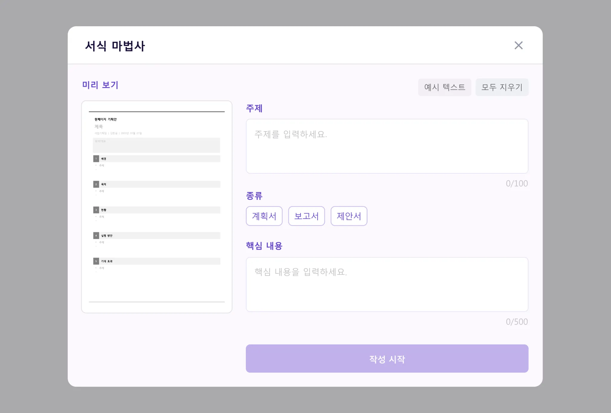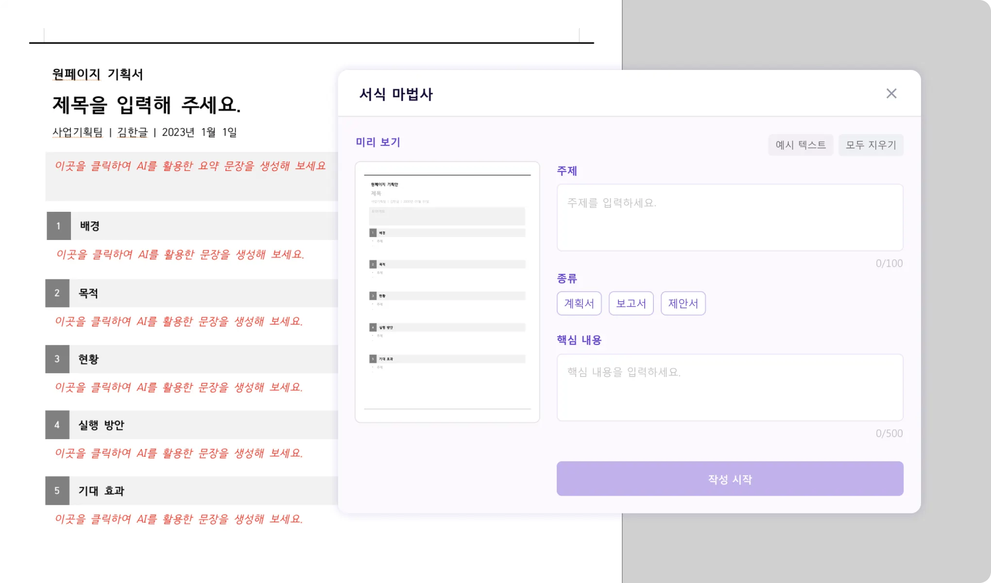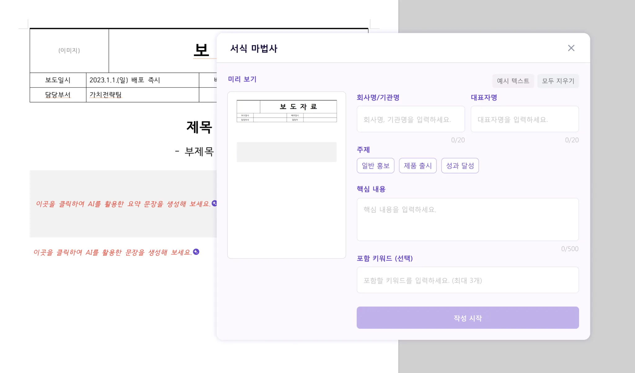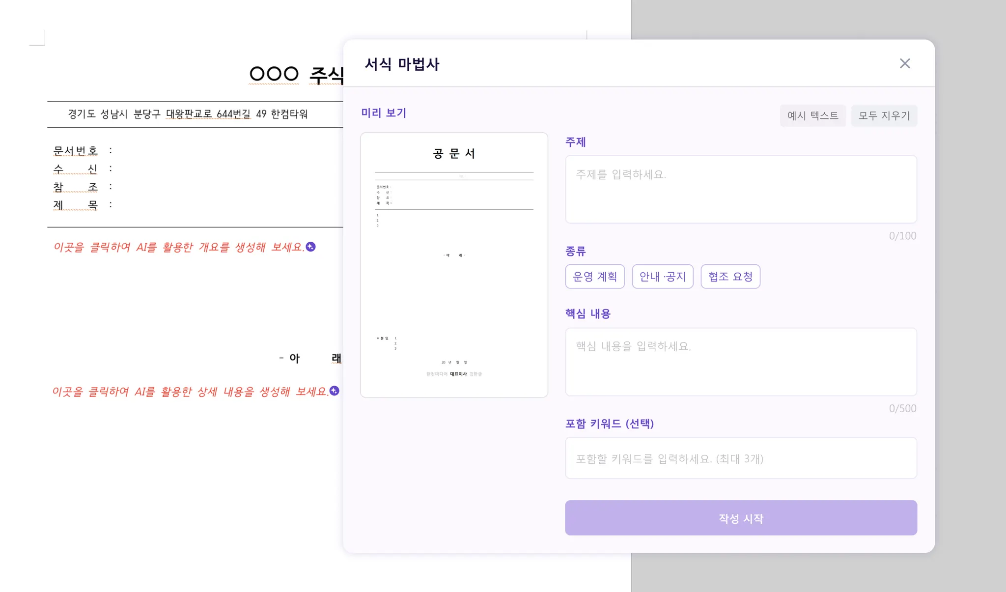 이력서를 제외한 나머지 서식은 생성할 때 필요 항목을 입력 후 ‘작성 시작’ 버튼 클릭 시 AI를 통한 초안이 생성됩니다.