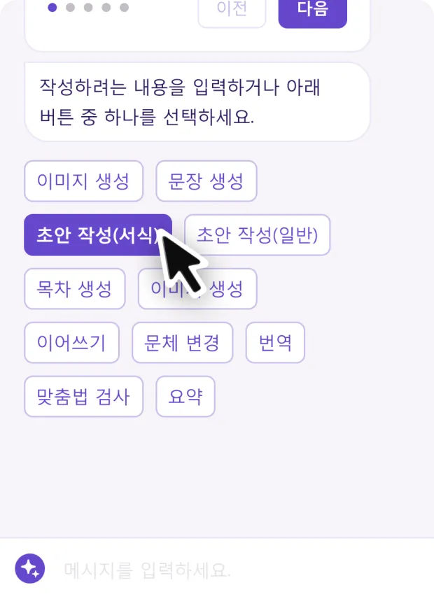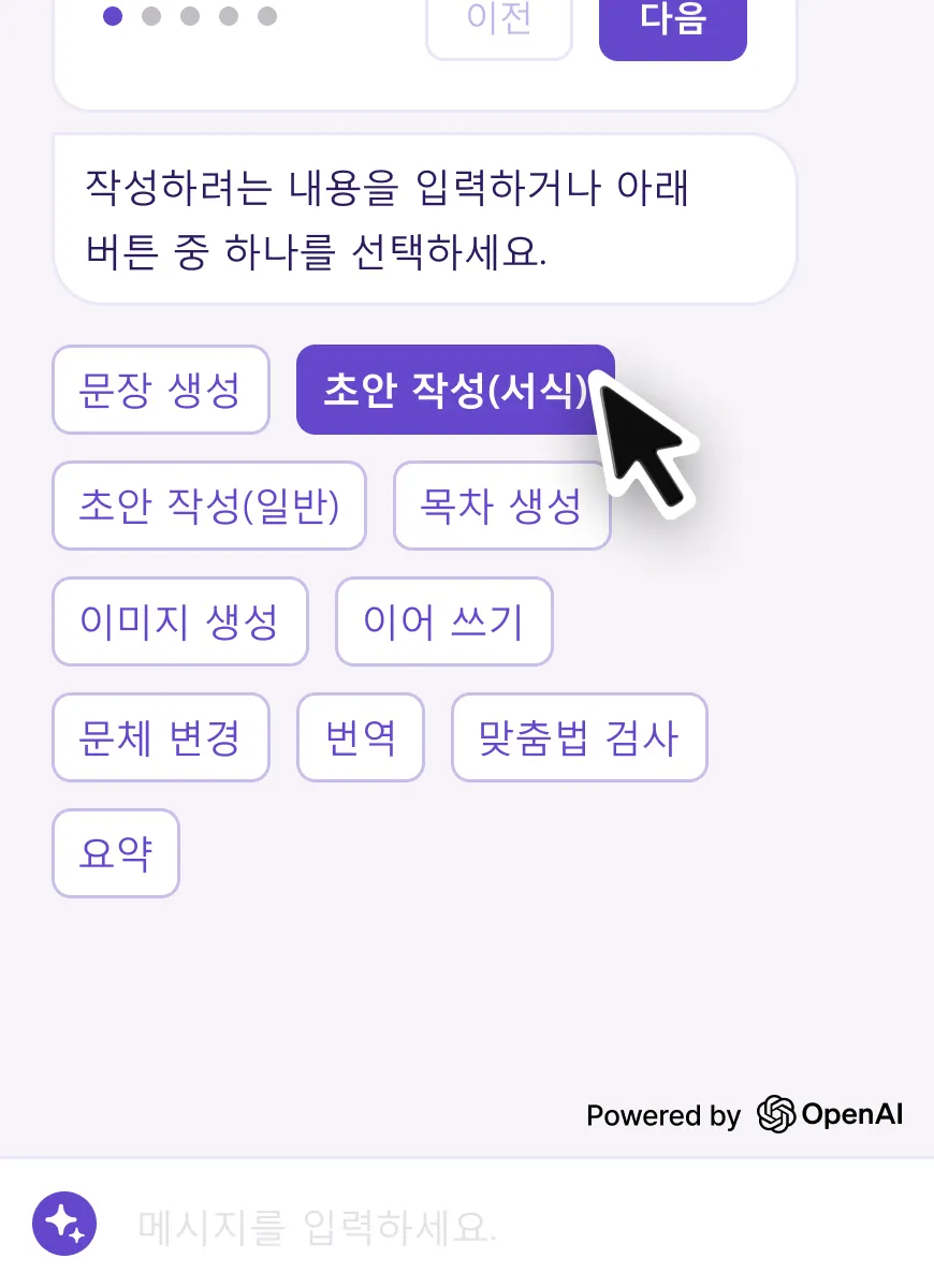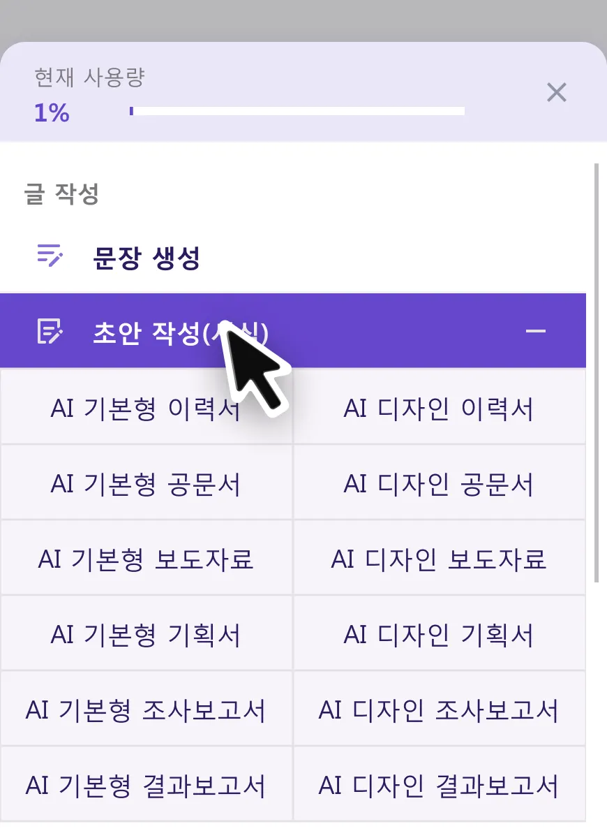 웹한글 진입 후 챗봇 영역을 활용하여 초안 작성(서식)을 사용할 수 있습니다.