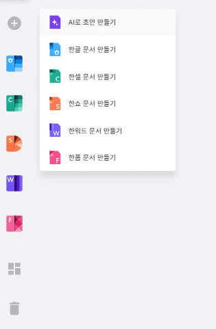 한컴독스 홈 화면 새로 만들기를 선택하여 AI로 초안 만들기를 실행할 수 있습니다.