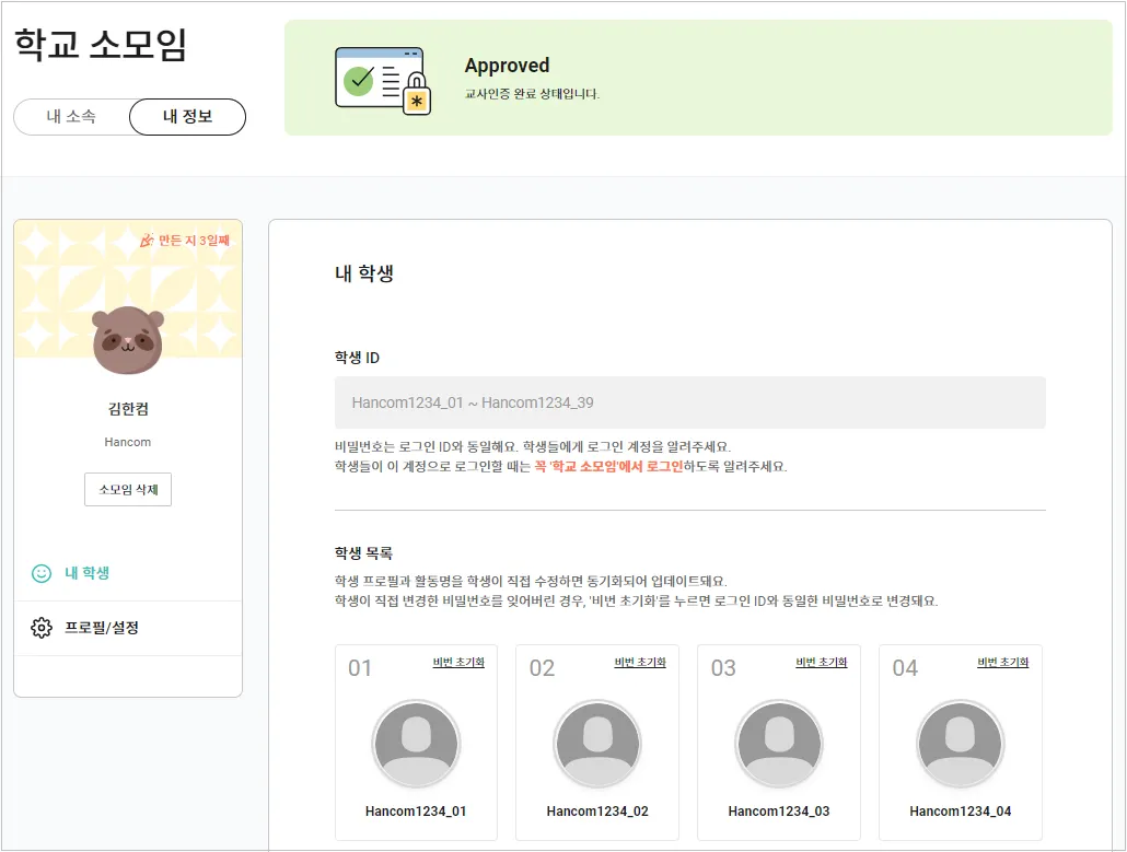 학급 학생들에게 소모임 참여용 학생 ID를 발급해 줄 수 있습니다.