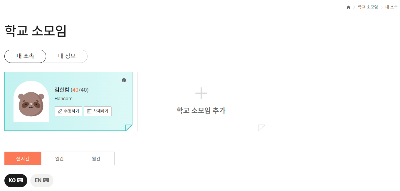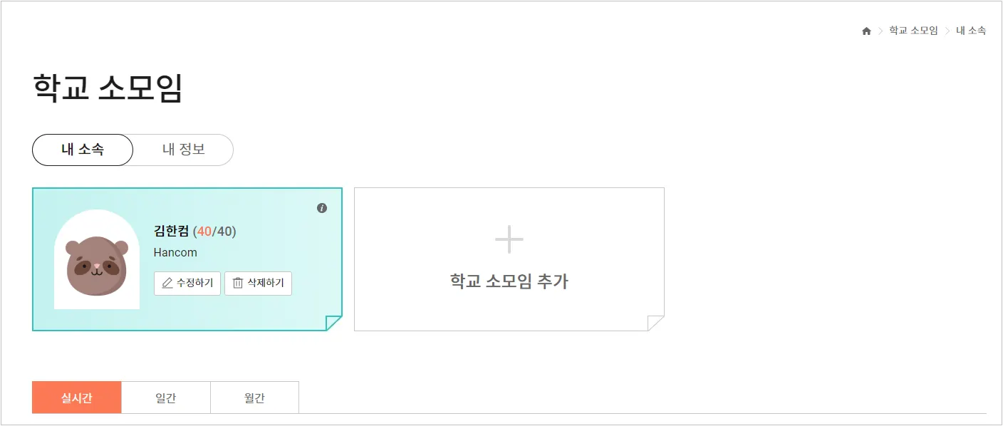 소모임을 생성하면 아래 사진처럼 소모임 페이지를 통해 학생들에게 학생용 계정을 발급해 주거나 활동을 관리할 수 있습니다.