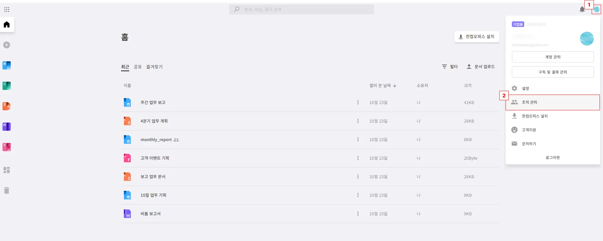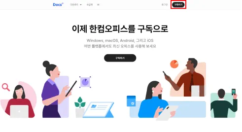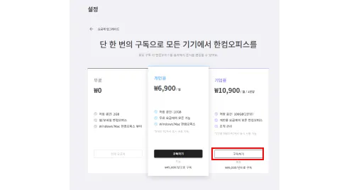 한컴독스 메인 화면 우측 상단 구독하기 버튼을 클릭 후, 기업용에서 원하는 요금제를 선택합니다.