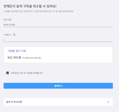 이용 금액 및 개인정보 수집 및 이용 동의 체크 후, 결제하기 버튼을 클릭하면 구독 및 조직 생성이 완료됩니다.