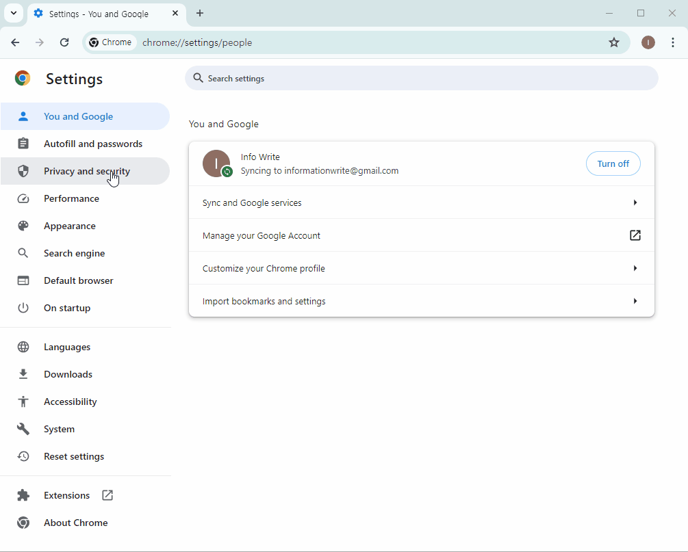 Navigate to Privacy and security on the left pane, then click Clear browsing data.