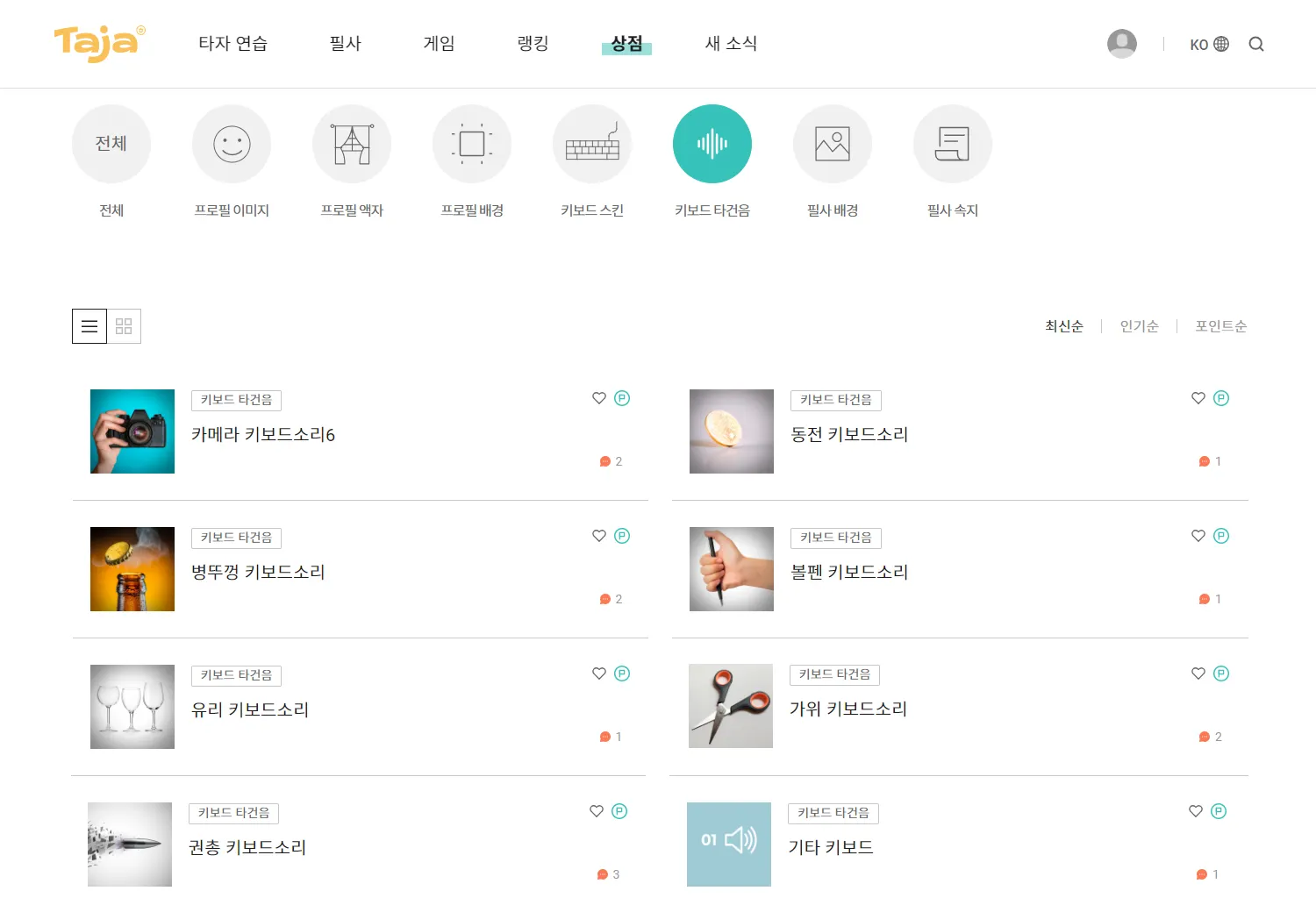 상점 > 키보드 타건음으로 가면 다양한 타건음을 미리 듣기할 수 있어요.